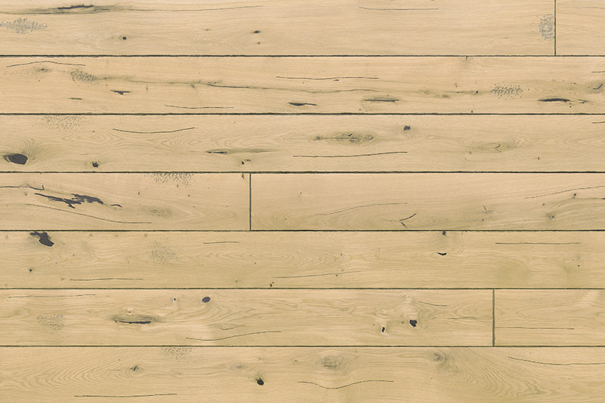 I love the atmosphere in old cellars where fine wines mature. The puffs of dust rising into the air. The pinhole traces of woodworm on wooden beams. Practically invisible in the lazy twilight reigning all around, detectable only to the fingers. And the silence... That is where excellence matures best. A heavily aged wood floor in a rustic style. Its finesse is in the natural qualities of the wood, brought out by deliberate ageing of the floorboards through manual planing, brushing and bevelling. The distinctive effect is intensified by deliberate scratching and denting of the surface, and fine holes imitating woodworm. Surface with extra protection by natural oil.