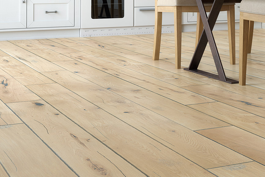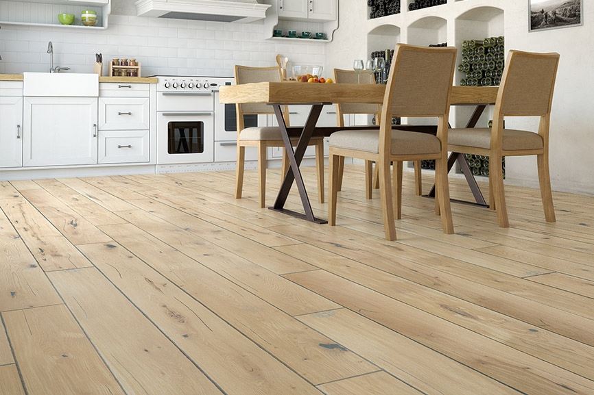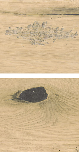 I love the atmosphere in old cellars where fine wines mature. The puffs of dust rising into the air. The pinhole traces of woodworm on wooden beams. Practically invisible in the lazy twilight reigning all around, detectable only to the fingers. And the silence... That is where excellence matures best. A heavily aged wood floor in a rustic style. Its finesse is in the natural qualities of the wood, brought out by deliberate ageing of the floorboards through manual planing, brushing and bevelling. The distinctive effect is intensified by deliberate scratching and denting of the surface, and fine holes imitating woodworm. Surface with extra protection by natural oil.